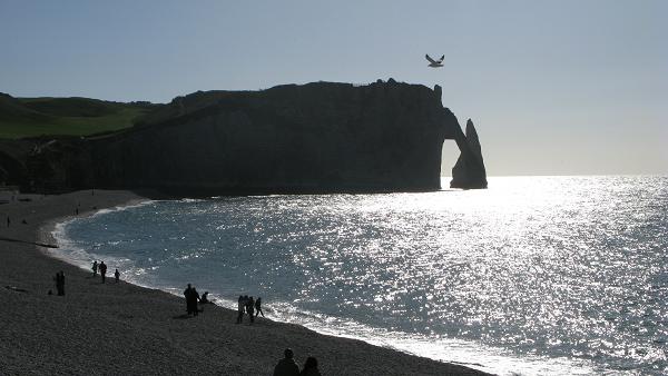 At Etretat, we walked along the beach then sat outside in a cafe with a hot chocolate , watching the sun go down and people make the climb up to the small church on the cliff top – painted by Monet. There is a sign on the promenade where he is meant to have stood to paint this view