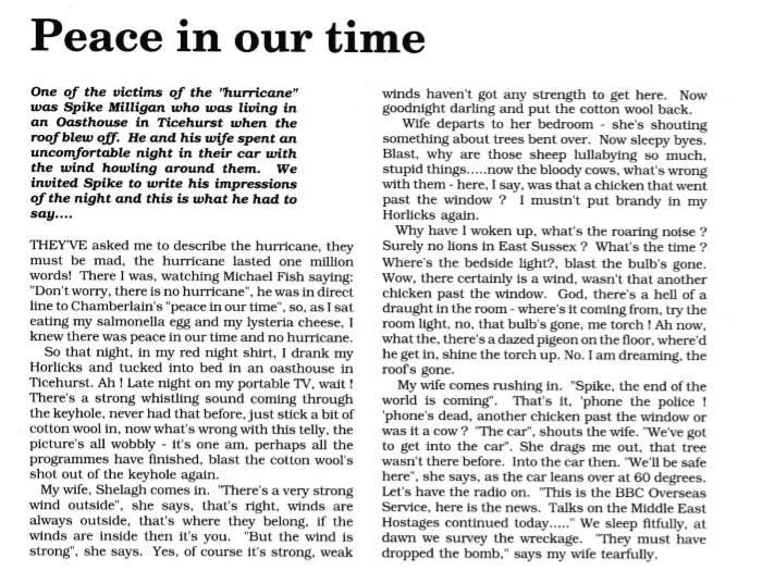‘One of the victims of the Hurricane was Spike Milligan who was living at this time in an Oasthouse in Ticehurst. He and his wife spent an uncomfortable night in their car – with the wind howling around them. Below are his impressions of that night ‘ very Spike Milliganish.